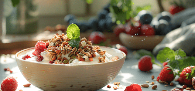 Composée de fromage blanc, huile de lin, céréales complètes, fruits frais et graines de lin, elle offre une richesse en micronutriments et protéines maigres. L’huile de lin, extraite par pression à froid, est particulièrement riche en oméga-3, essentiels à la santé cardiovasculaire. Les fruits frais et les céréales complètes apportent des vitamines et minéraux, améliorant ainsi la vitalité et l’équilibre nutritionnel.